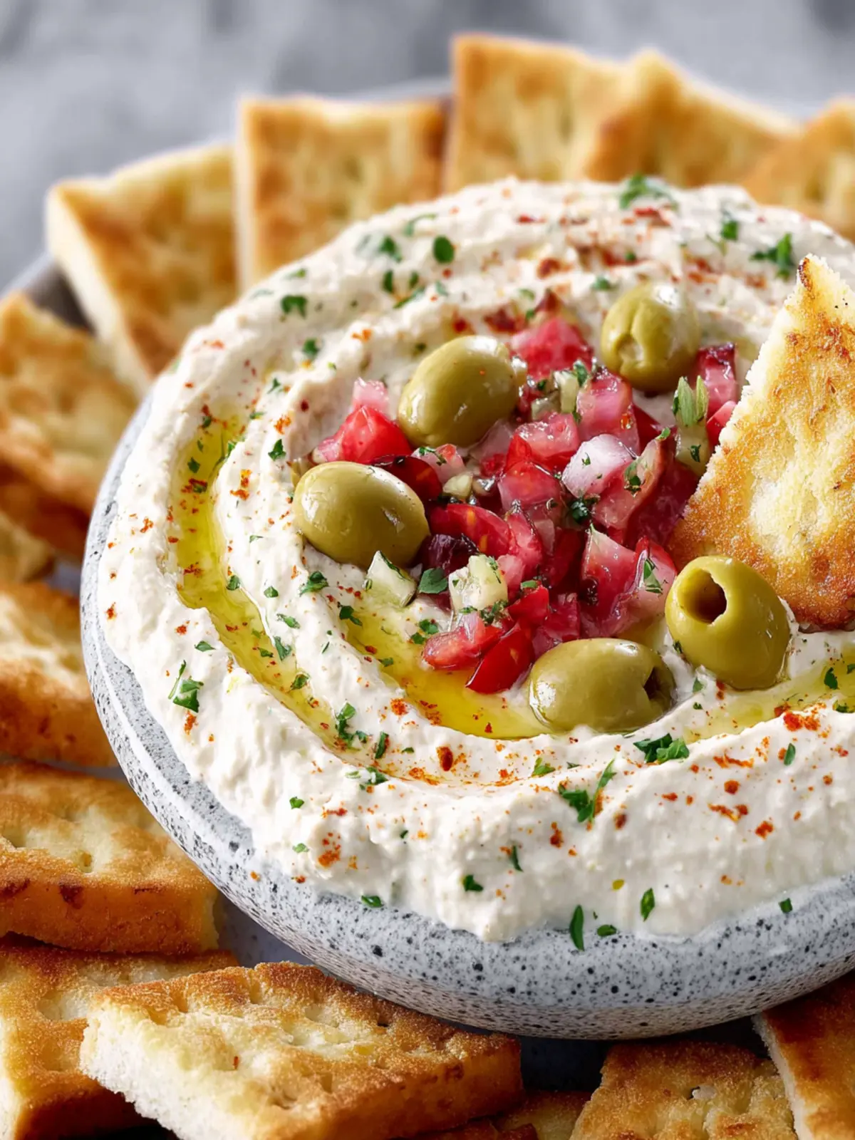 A delicious, creamy dip filled with olives, perfect for serving with pita crackers.
