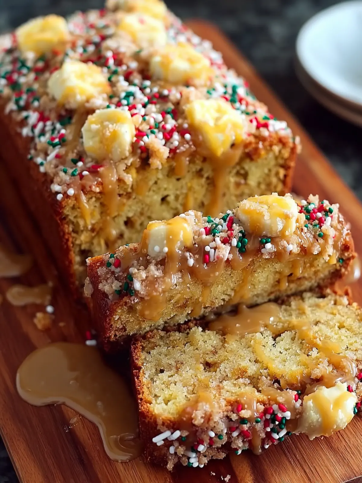 A delicious and moist banana bread made with ripe bananas and topped with optional cookie dough.