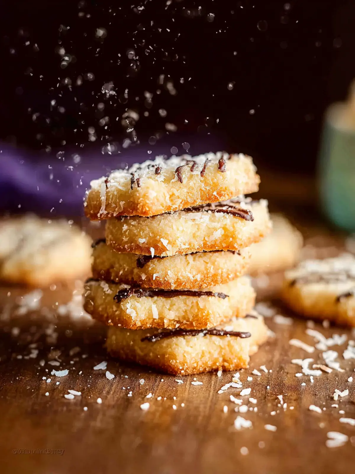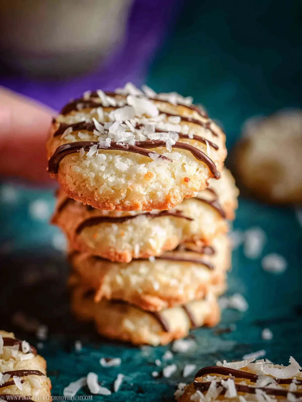 Finally, a sprinkle of toasted coconut on top adds not only a crunchy texture but also an aromatic bite, enhancing both the visual appeal and flavor profile of these delightful cookies.