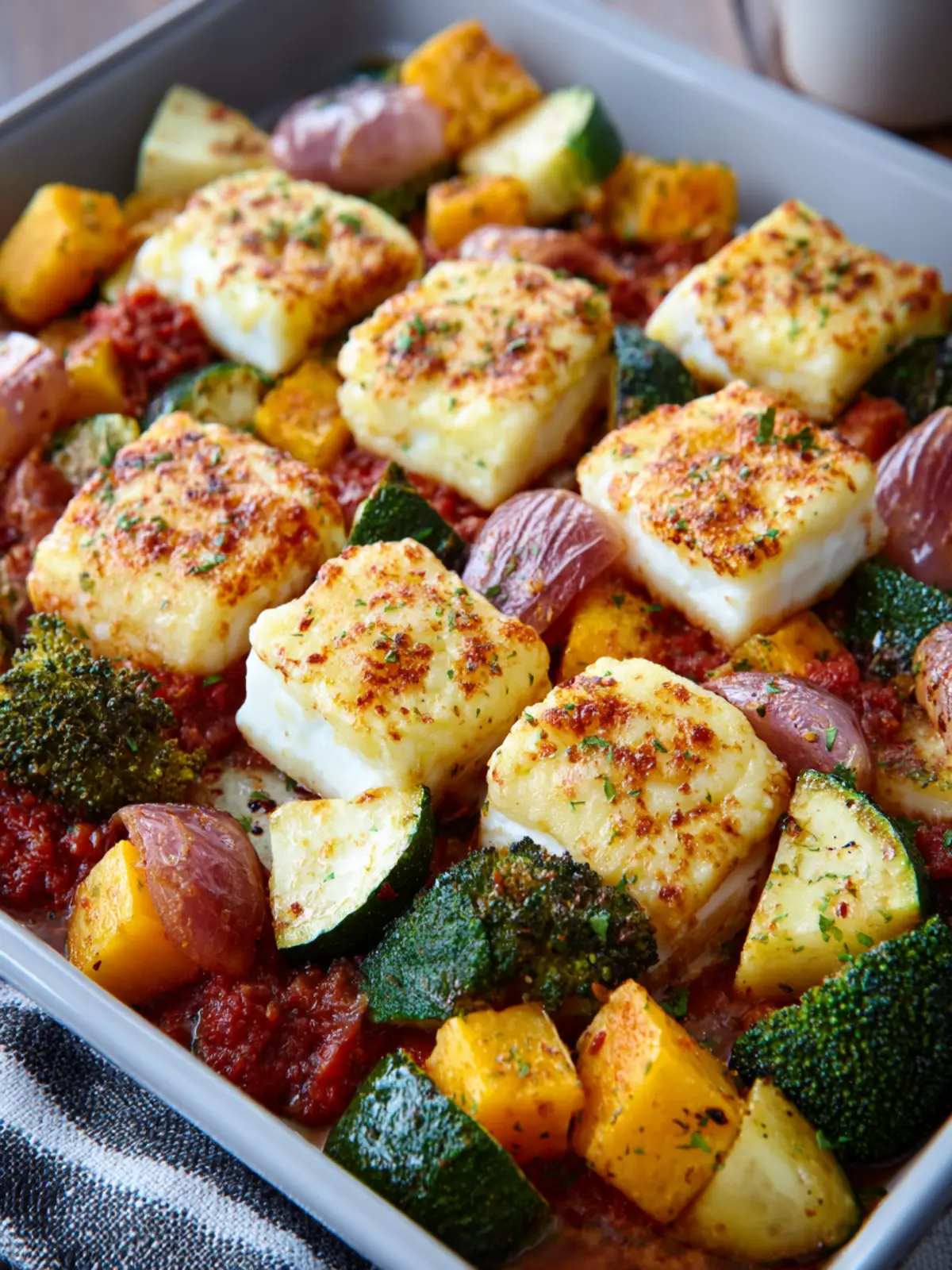 - Bake for 25-30 minutes or until halloumi is golden brown and veggies are tender.