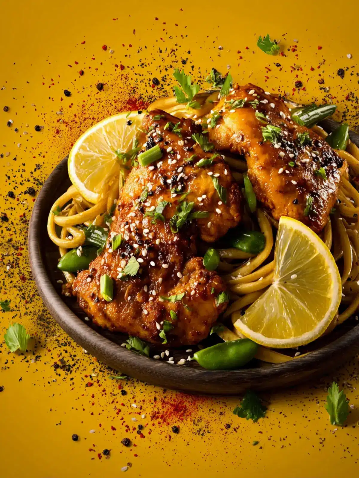 - Serve the chicken with the noodles, topped with spring onions, black pepper, and sesame seeds. Decorate with lemon slices if you like.