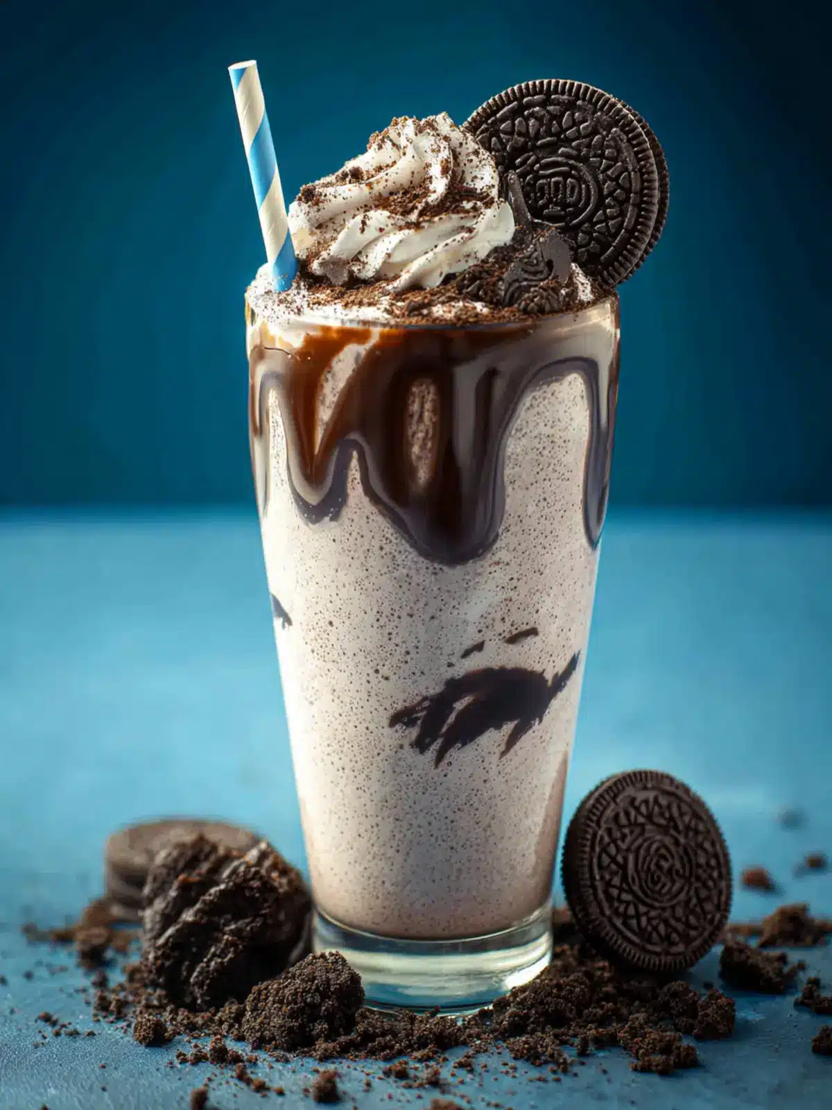 A delicious and creamy Oreo milkshake topped with whipped cream and chocolate syrup.