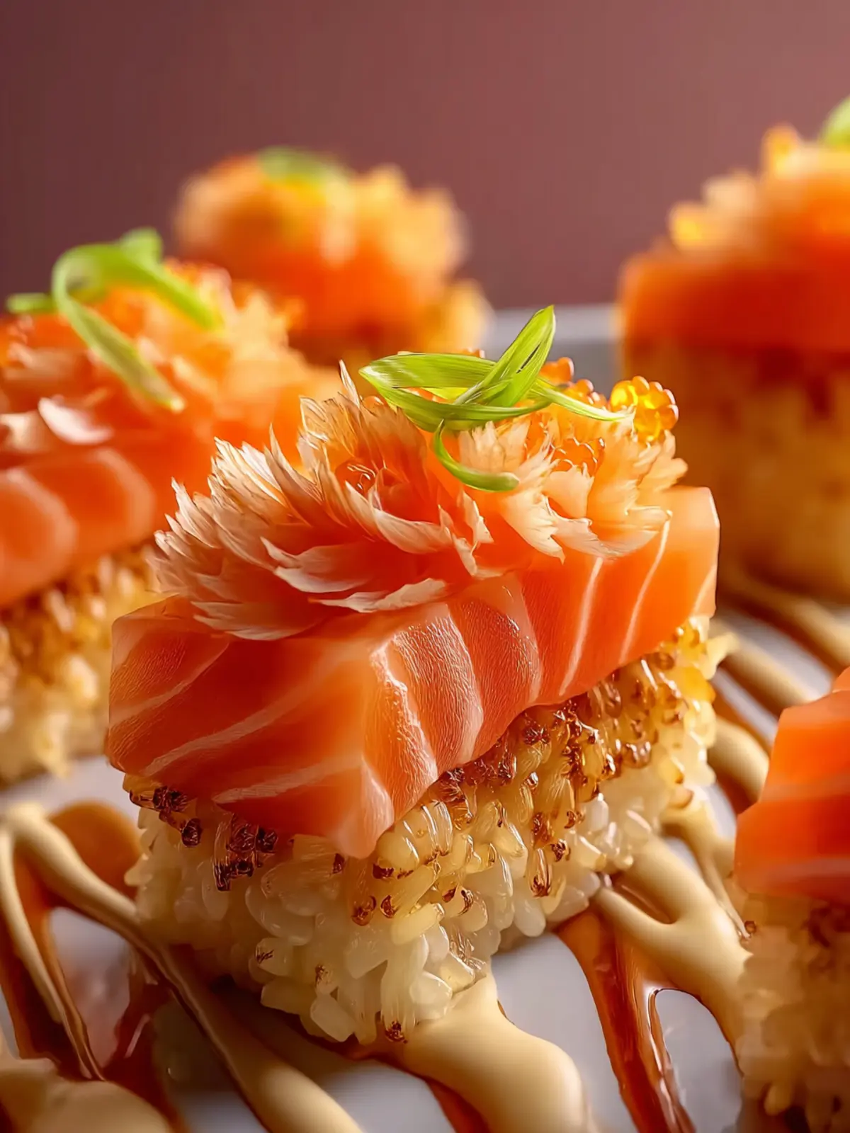 Deliciously crispy sushi rice cakes topped with seasoned salmon, perfect for a unique appetizer or snack.