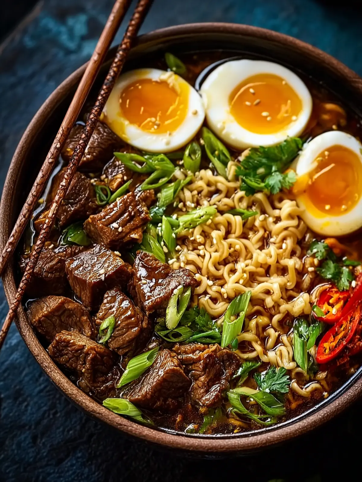 - Ladle the beef and broth over the cooked ramen noodles in bowls.