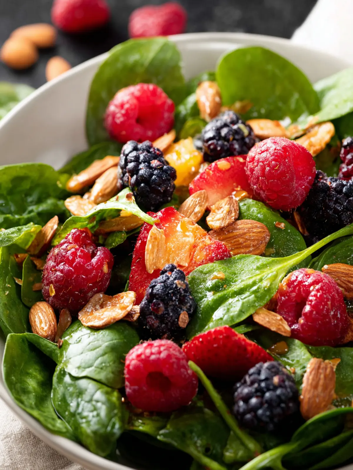 Flavor Harmony: The contrast between the sweetness of the berries and the savory notes of the spinach creates a well-rounded flavor profile. And let’s not forget the brown sugar almonds, which add a delightful caramelization, making each forkful a sensory delight.