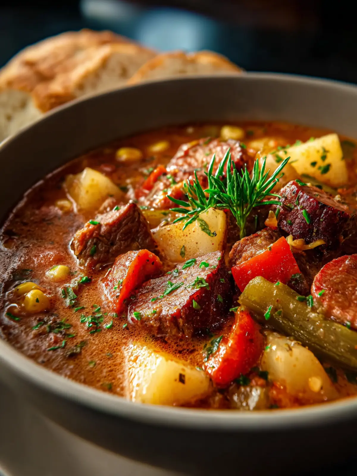 A hearty stew featuring smoked sausage, beef, and beans, perfect for a comforting meal.