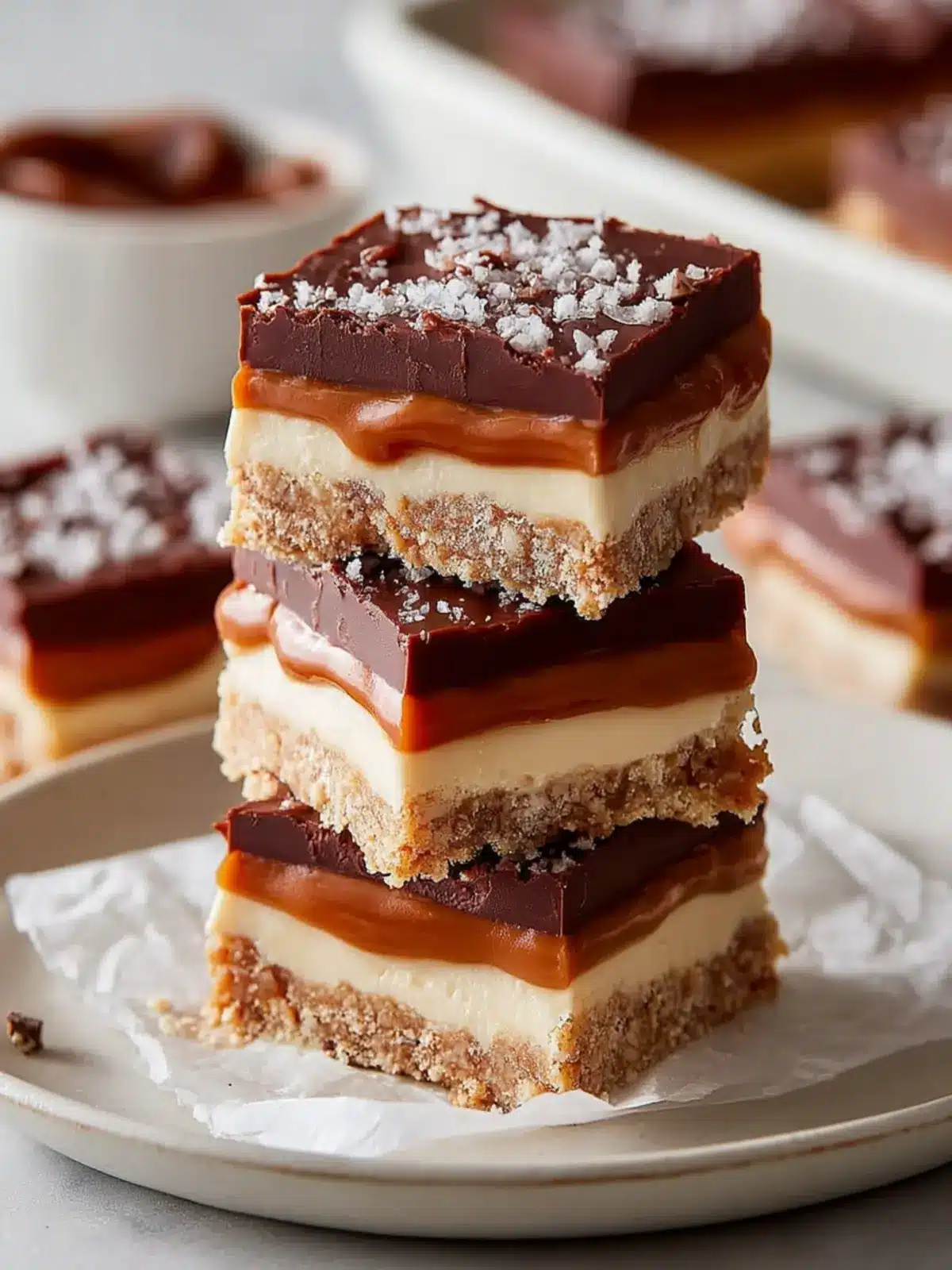 Let the layers set properly in the refrigerator before slicing. It allows the chocolate to harden and makes cutting easier. You don’t want your bars to fall apart when you serve them!